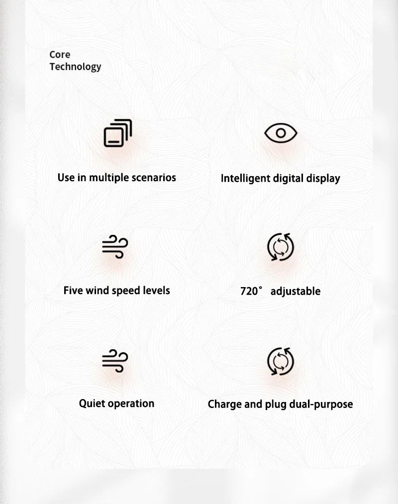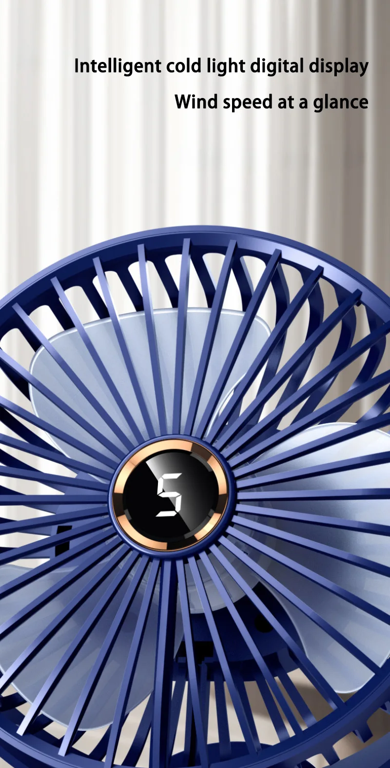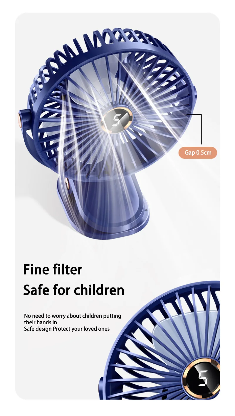 [5 speeds & low noise] The small portable fan has five adjustable wind speeds. The cooling fan adopts a high-quality brushless motor, providing powerful wind power while maintaining quiet operation.